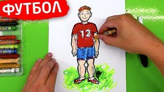 Придаем телесный цвет коже при помощи бежевого карандаша. Также на этом этапе используем коричневый для волос. Элементы на футбольном мяче закрашиваем черным цветом.