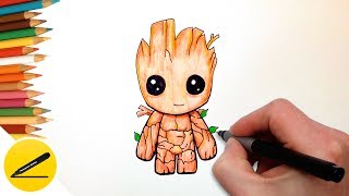 Дорабатываем рисунок светлыми коричневыми оттенками, а также белым карандашом. При желании используем гелевую ручку. Вот и готова голова Грута из Марвел цветными карандашами.