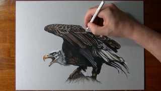 В последнем шаге все, что вам нужно сделать, это наметить левое крыло и добавить на него оперение. Дорисовываем последние штрихи в области когтистых лап и рисуем пень. Завершите рисование пунктирными хаотичными линиями изображая перья орла. Сотрите все вспомогательные линии и все готово!