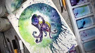 По завершении берем в руки черный линер, который прорабатываем весь акварельный рисунок осьминога. Дополним деталями. Вот и получаем готовый рисунок осьминога акварелью и черным маркером. Такая иллюстрация дополнит любой рисунок на морскую или летнюю тематику.