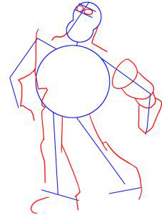 Теперь вы будете использовать форму его шею, а затем начать рисунок из стройных изложением его тело, которое включает в себя его руки, ноги и ступни. Вам также необходимо включить два круга для глаз, а затем перейти к следующему шагу.
