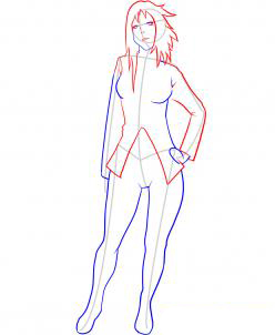 Здесь необходимо наметить весь контур тела для Карин, как вы видите здесь. Когда тело поза набросал в не забудьте добавить подкладка для ее пышные ноги, бедра и грудь. Следующая наметить фактической формы головы, лица и структуры, то рисовать в начале линии глаз.