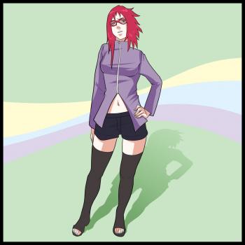 Она шестнадцать-летняя женщина, которая красные волосы, и она часто носит очки. Хотя она очень похожа на девушку, ее личность и характер такой же, как злой человек или мужской фигуры из Наруто. Существует гораздо больше информации по этому женский персонаж из серии.
