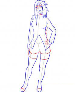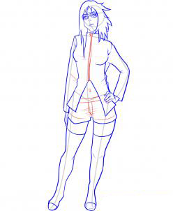 Тщательно привлечь в ее очки, а затем обратить воротник сверху. Добавьте складки, раз, и морщинка линии вдоль стороны ее за талию, а затем закончить рисунок из правой руке. Как только это будет сделано получить эти шорты вытягивается, а также ноги. Шапка вершины ее леггинсы и рисовать линии маркировки на кончике ее ногой, как вы видите здесь.