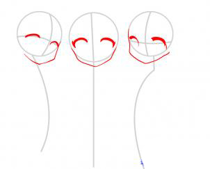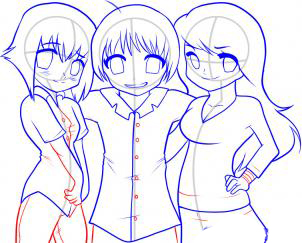 Перейти на вытянуть глаза формы, но убедитесь, что они являются своего рода продолговатые и квадрат в основании. Затем, нарисуйте в брови for4 женских персонажей, а также румяна марки на рисунке слева.Каждое аниме вы видите здесь имеет уникальное выражение на лице. Ничья в нос девушки, и то все три из их ртов. Наконец, переходим к шагу четыре.